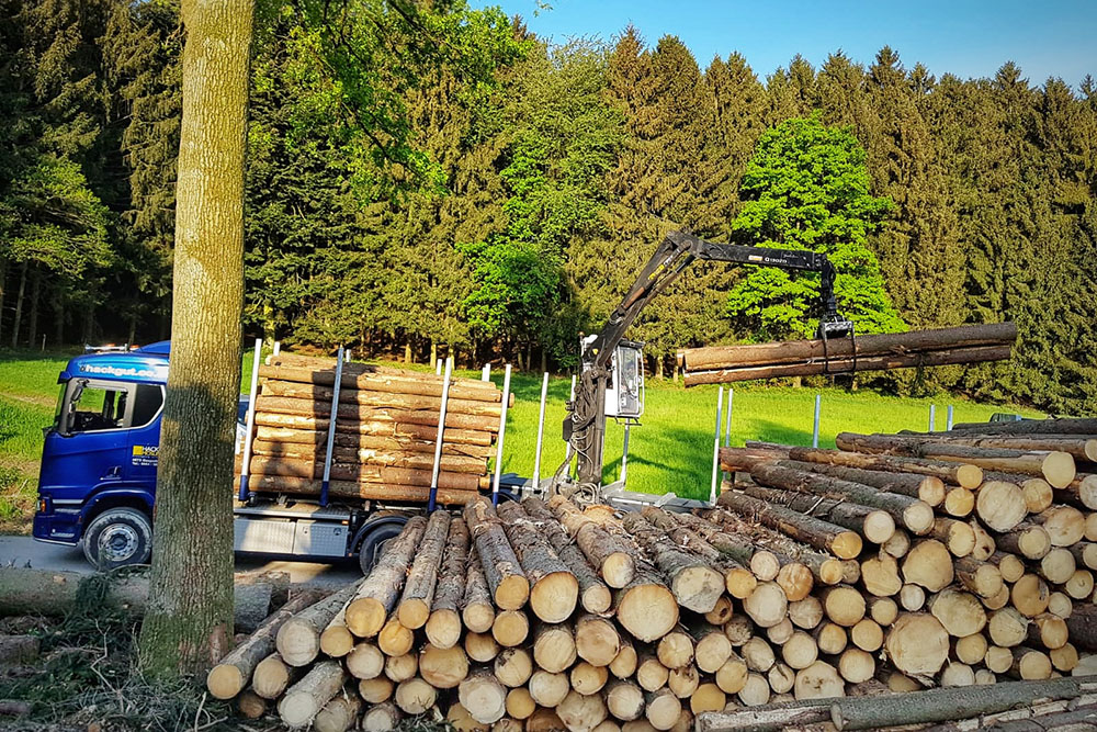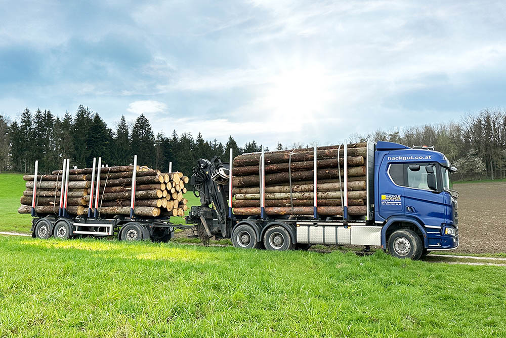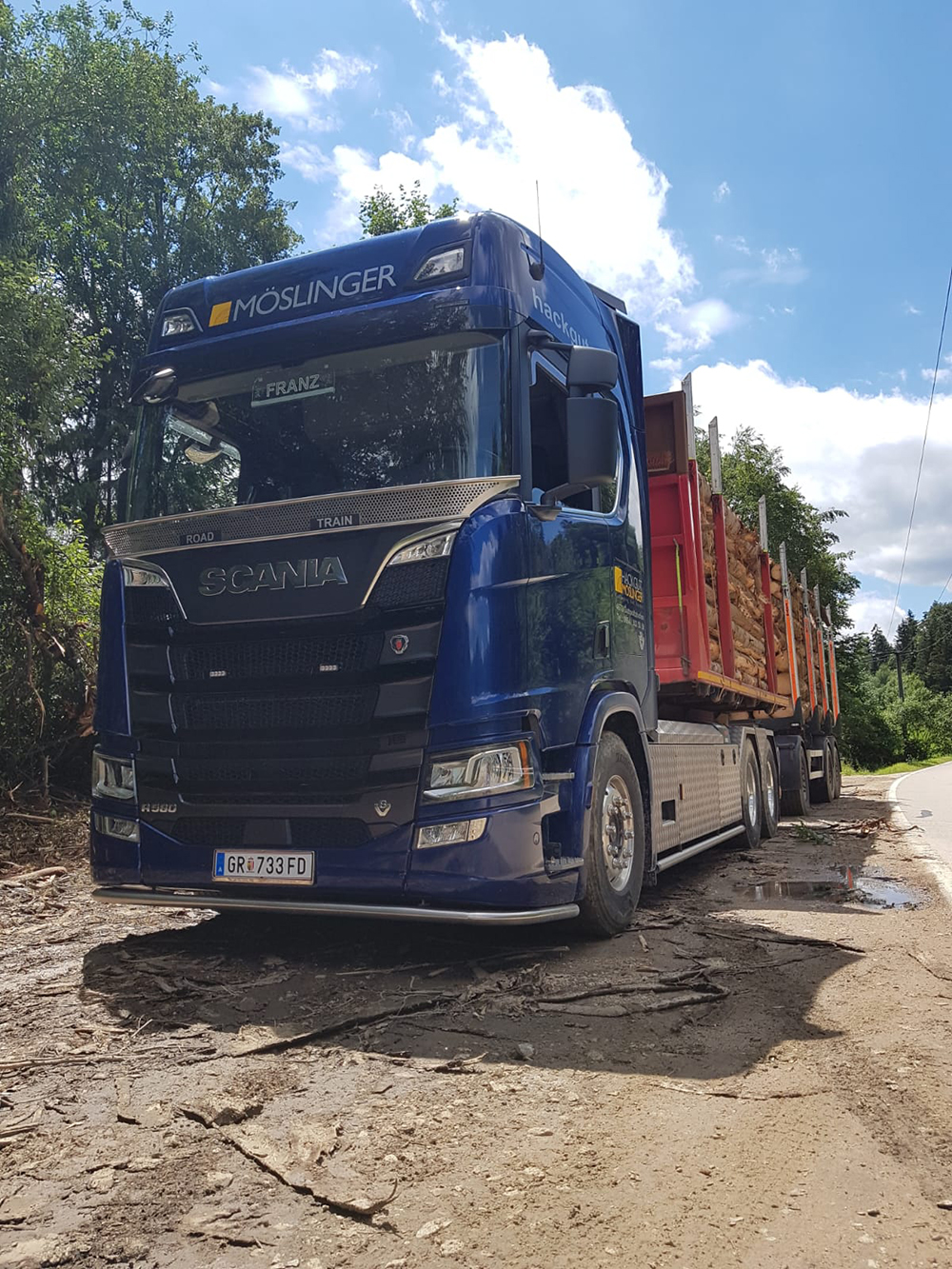 Hackgut Möslinger GmbH – Hackguterzeugung Oberösterreich  »  Fuhrpark  »  Scania Holztransporter mit Kran
