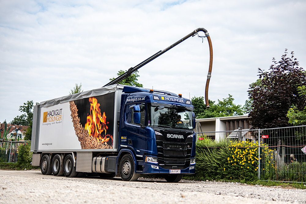Wir pumpen Ihnen den Rindenmulch direkt aus dem LKW dorthin, wo er benötigt wird.
